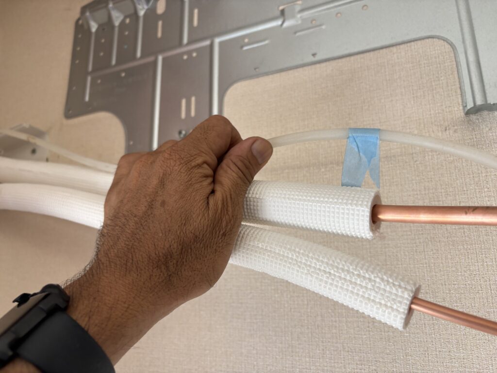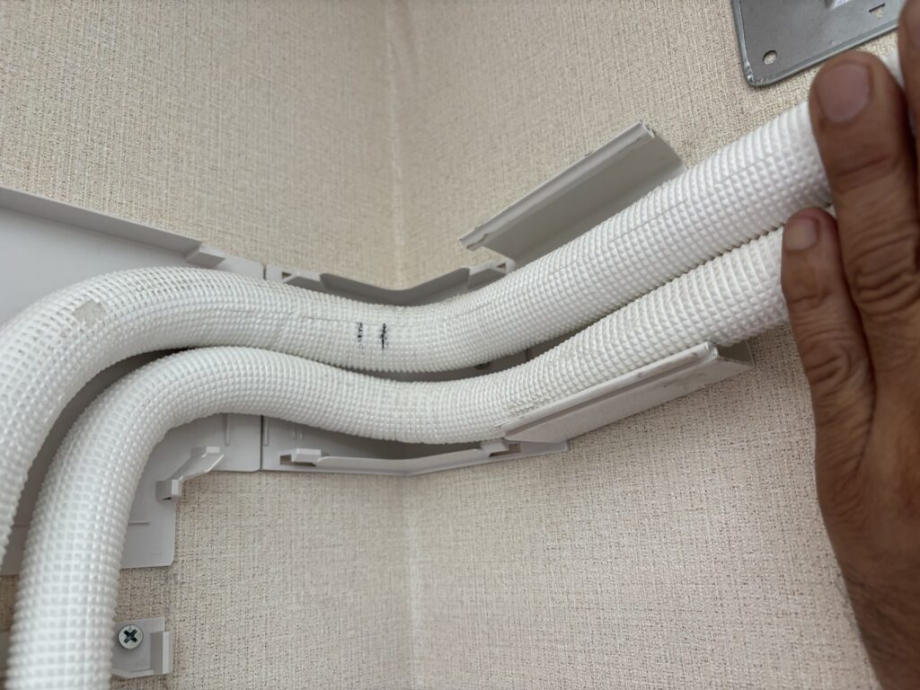 プラスチックのベンダーを当てて必要な長さをマーキングして配管に差し込みエアコン配管の形を整えます☝️