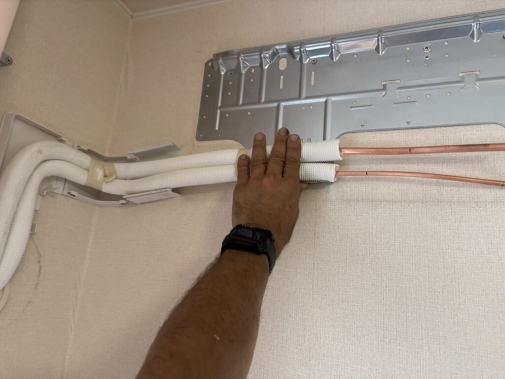 このようにエアコン配管を整えてエアコン室内機を掛けてかけつなぎという技?技法?を使います