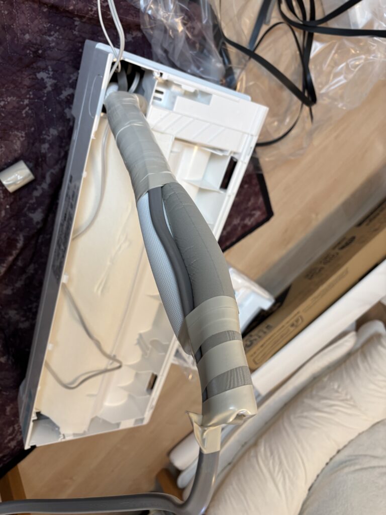 今回はエアコン室内機を取り付けてから現場状況に応じて外で配管を接続します